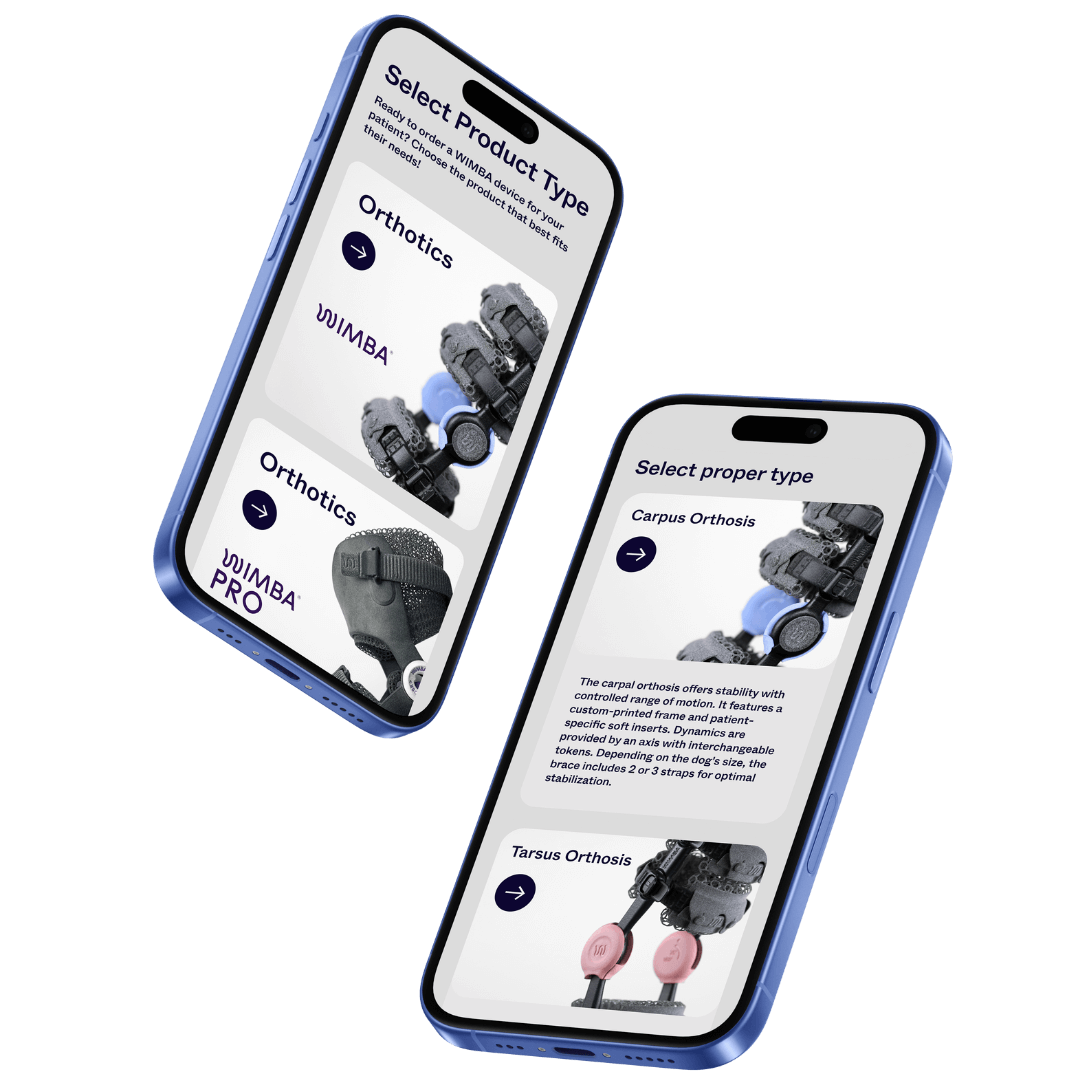 You can order both WIMBA Go and WIMBA Pro devices for pets, including Carpal, Tarsal, Stifle Orthosis as well as Cervical collar. Veterinary professionals can order WIMBA Prosthetics Pro using the app as well.