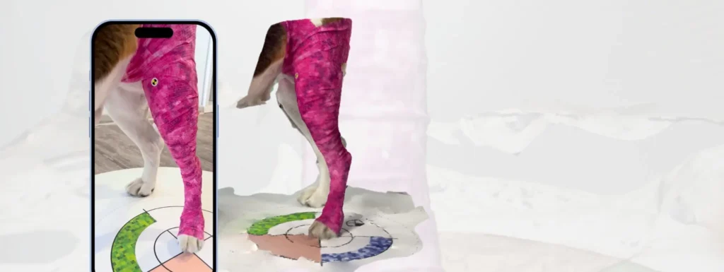 For WIMBA Pro: Your WIMBA Provider uses a smartphone, calibration mat, and WIMBA Autodolly (a smartphone holder) to capture a precise 3D scan of your pet’s affected limb.